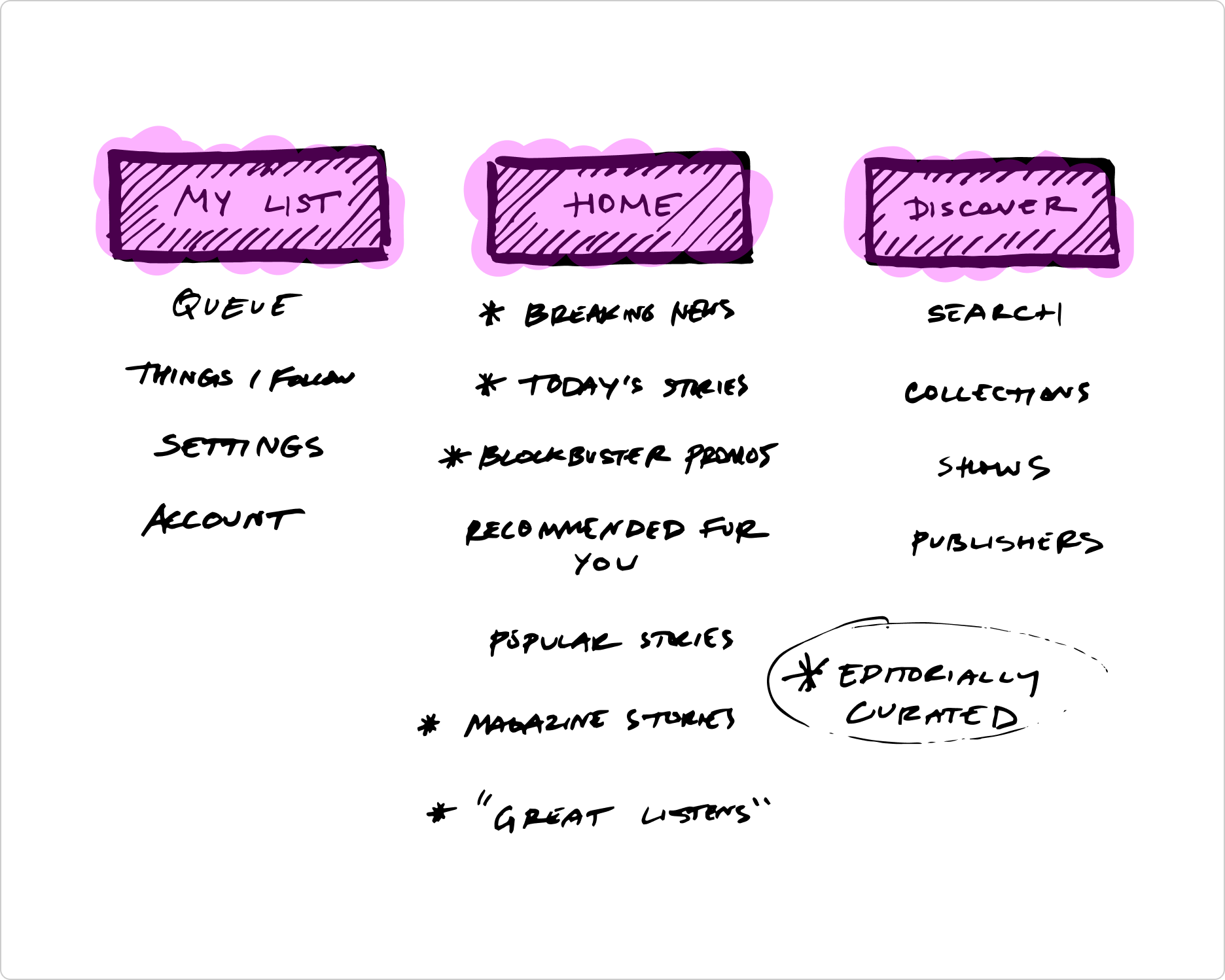 Between each of the early concepts we explored—which we vetted in early rounds of user research—we started to coalesce around a simple, three tab structure as a north start that contained—an editorially curated Home, a Discover acting as a search and catalogue, and My List which would house expected user preferences. This set the foundation for what we could build quickly and start learning from.