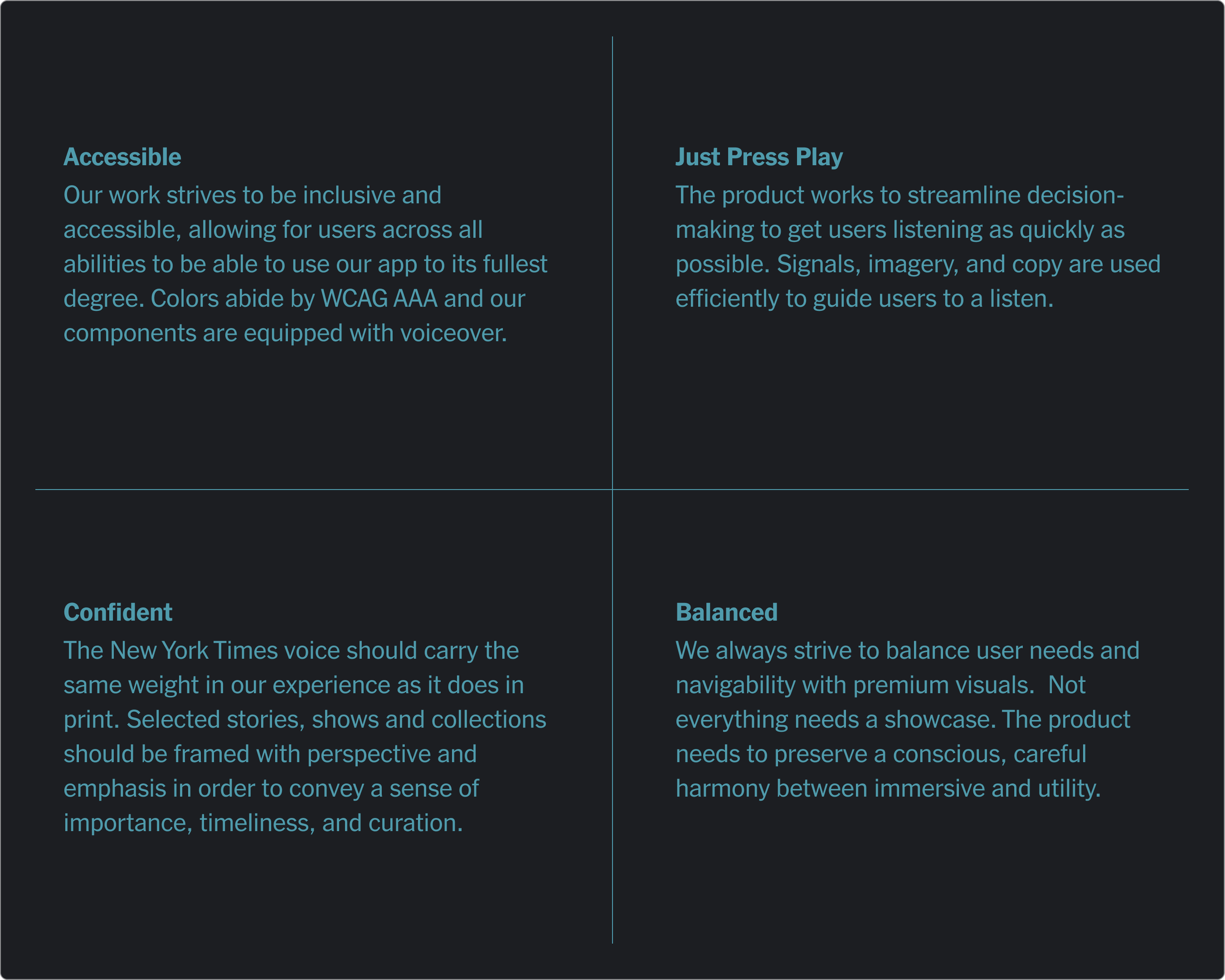 We wanted to capitalize on the Times’ reputation as a voice of authority. Our assumption was that we could position ourselves as a daily recommender of high quality audio journalism.