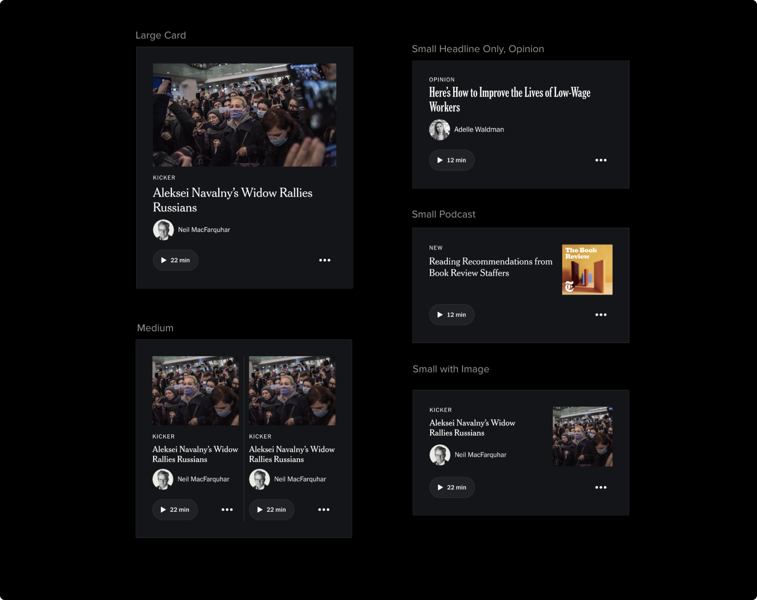 Daman and I co-faciliated our conversations with our editorial partners. I led the development of the new card toolkit, leveraging the type styles set in place by our Times Product Language team—to ensure we maintained consistency with the core app, and to ease implementation by using tokens that they built.