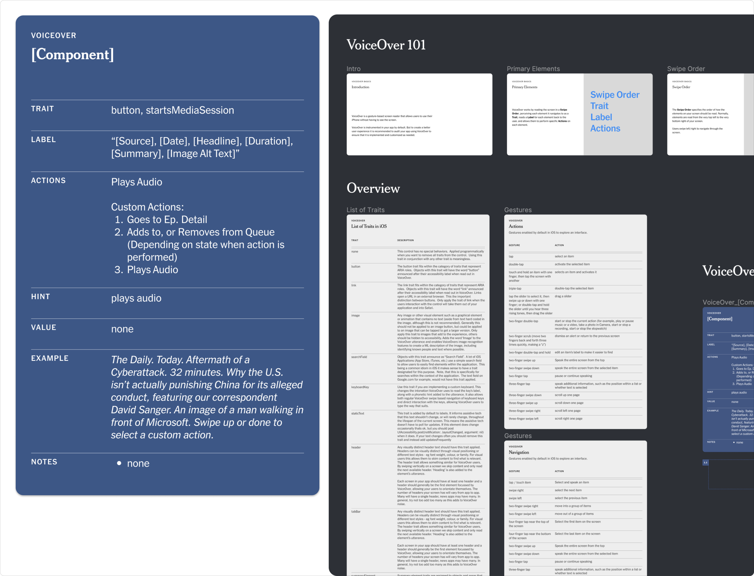 Accessibility and VoiceOver documentation guidance that I created. Has been adopted by the product design org at The Times for other teams to leverage.