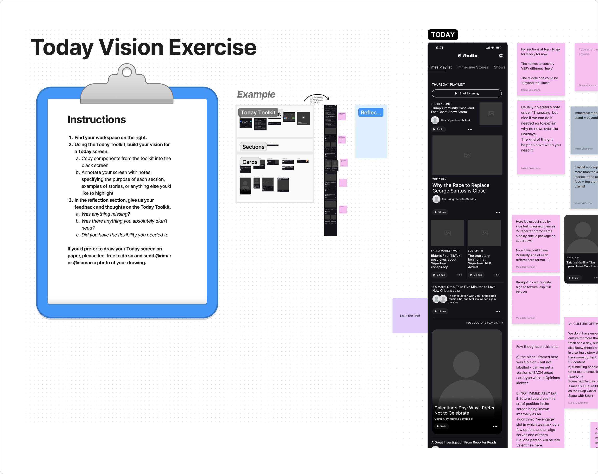 Throughout the design phase, I also worked closely with one of our iOS engineers, Alvin Andino, to establish our approach to VoiceOver. Given that audio by nature is a medium that makes the Times’ journalism more accessible for individuals with visual disabilities, I wanted to ensure that we considered how those users might navigate the experience. One area specifically was exploring how we might make navigating the Today screen feel more seamless.